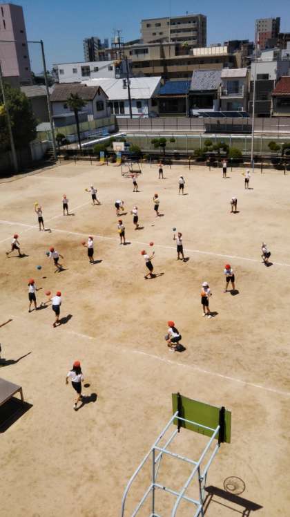 体育の時は、マスクを外してもいいことになりましたが、その分距離を広くとらなければなりません。写真は、5年生がボールを使って巧みな動きの学習をしているところです。