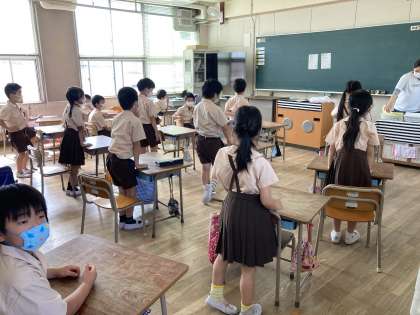 通常授業が始まって2週間が経とうとしています。子どもたちは、朝の健康チェックやこまめな手洗い・消毒にも慣れてきてました。緊張感もほぐれ、にぎやかさが戻りつつありますが、「友だちと仲よくちょっとはなれて」には、戸惑っているようです。