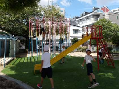 昨日のジメジメからうって変わって、カラッとしたさわやかな朝を迎えました。とはいえ、日差しはまだまだ強く、日なたは汗ばむくらいです。2限が終わった後の長い休み時間では、やはり日かげが人気のようで、多くの人でにぎわっています。なかには上り棒を一番上まで登り切った人もいて、とてもビックリしました。またグラウンドではドッヂビーやバスケットで盛り上がっていて、遠いところからバスケットゴールめがけてシュートをする人もいました。みんな元気いっぱいで、いいね〜!
