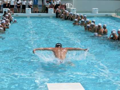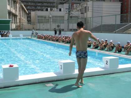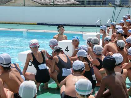 2時間目の講演後、プールで実技指導がありました。クロールの指導です。手は水面をたたかない、外側をかかない、指先からそっと水に入れる、体の中心をかくなどの注意点を教えていただき、何回も25メートルを泳ぎました。ゆっくり泳ぐ、そっと指から・・・的確な指導を自分で気を付けて練習していくと上手に泳げるようになった人が増えました。山本氏はまとめとして「なんで上手になったかわかりますか。聞く耳を持つこと、素直に心で受け止めること、実践することで上手になっていくのです。人間はそれが大事です。頑張ってください」とエールを送ってくださいました。きっと子どもの心に響いたことと思います。山本貴司さんありがとうございました。