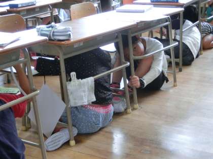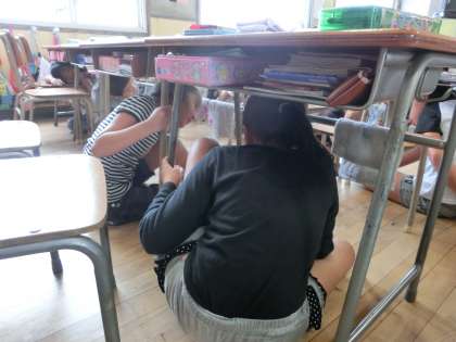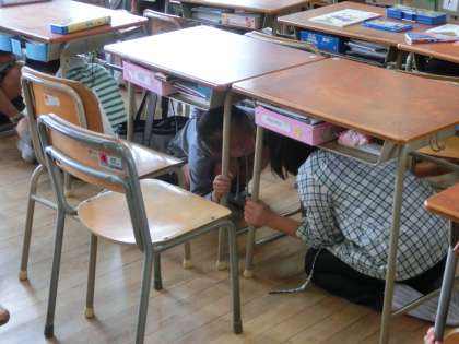 9月5日(金)11時に大阪880万人訓練がありました。学校の屋外スピーカーから無線放送があり、地震の対応訓練がありました。放送にしたがって3年生がいっせいに机の下にもぐりました。机が揺れたり倒れたりしないように椅子の足をもって窮屈な姿勢で命を守る訓練をしました。地震はいつおこるかわかりません。自分の命は自分で守れるように防災意識を高めることが求められています。