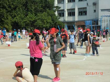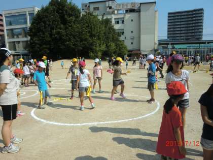 7月12日(金)朝から暑いですが、暑さに負けず運動場で縦割り集会です。今日は、縦割り班で考えた遊びをしました。ボールあてやじゃんけんゲーム、鬼ごっこ、縄跳びなど汗をいっぱいかいて仲良く楽しく活動できました。「今日は楽しかったですか。楽しかった人は拍手をしてください。」リーダーさん、ありがとう。