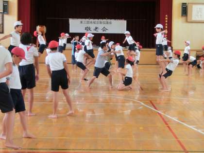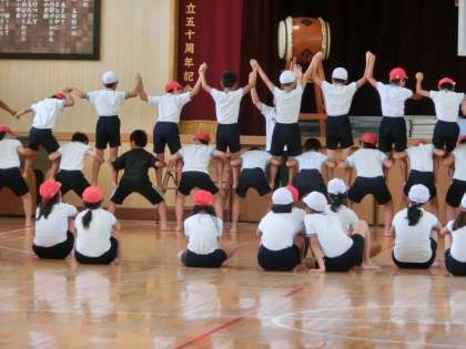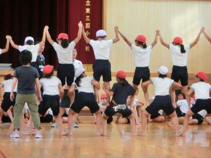 5,6年生の組体操の練習には熱が入ります。演技最後のほうの技でしょうか。男子1列、女子1列でそれぞれ足の上に立ち上がります。上にのっている人は手をつないで静止します。でもまだうまくいきません。こらえきれずにぽろぽろくずれます。下の人は足をつかんで後ろに体重をかけて、ぐっとがんばります。みんなで決めることができればとってもかっこいい技です。2人組でする、肩車から頭を抜く「サボテン」です。まだ時間はあります。だいじょうぶ。5,6年生、頑張ってます!