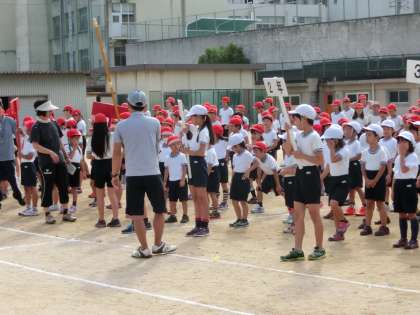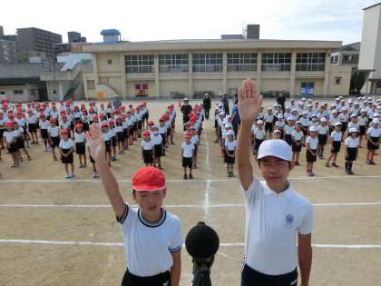 9月22日(月)運動会の全体練習です。開会式と閉会式の練習をしました。更新の仕方、整列の仕方、歌の練習、ラジオ体操の練習、優勝旗の返還と授与、準優勝盾の返還と授与、宣誓の練習と盛りだくさんです。月曜日の朝いちばんでちょっと暑いこともあって、子どもたちはあんまり元気がありません。大丈夫かなあ。歌の声も小さいなあ。心配やなあ。でも明日はお休みです。元気にいきましょう。