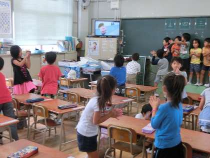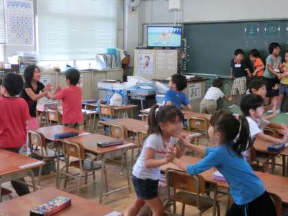9月25日(木)雨の影響で運動場が午前中使えませんでした。1時15分。昼休みにやっと運動場が使えるようになって多くの子どもたちが運動場で遊んでいました。が、1時30分。フォニックスの音楽が流れてきました。今日は掃除の時間にフォニックスです。子どもたちは走って教室に戻ります。1年生の教室ではDVDをみて子どもたちが嬉しそうに歌ってふりを付けていました。「オープン、シャット・・」実に楽しそうに友達と押したり引いたり手を振ったりしています。そのあとはABCソングでしょうか。たった15分ですがとても大きい15分です。