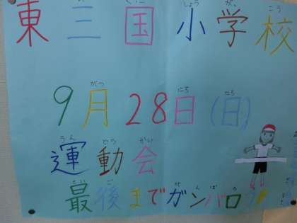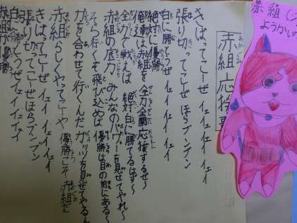 運動会の赤組、白組の応援歌ができています。職員室前の掲示板に貼っています。それがとても上手にできています。誰が考えたのかすごく上手です。いつもながら本校の応援団は毎年すごく一生懸命でびっくりします。気合が入っています。ものすごく盛り上がります。運動会で披露されるのが楽しみです。本当によく頑張っています。応援団、いいぞー!