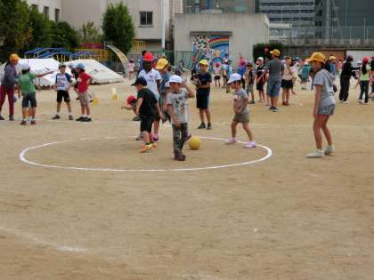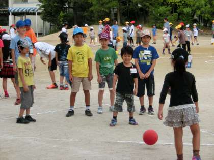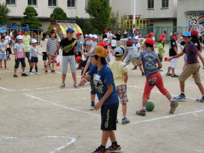 今朝の集会は運動場で縦割り班ごとの遊びです。今回はほとんどの班がいわゆる中あてドッジボールです。低学年用にコートも狭く、下投げでボールを転がします。5・6年生がやさしく投げていました。すごく手加減しています。あちらこちらでにこにこしながら楽しんでいる顔が見られました。遊びが終わってから遅れて登校してきた1年生が「残念やったわー。これからは遅刻しないようにがんばります」と言っていました。そうそう、遅刻したら損やでー。