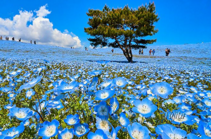 左のネモフィラは、国営ひたち海浜公園のなかの「みはらしの丘」というところのもので、毎年11月に種まきを行い、4月中旬〜5月上旬に写真のような風景となります。「絶景」スポットとして近年人気がある公園です。JR常磐線勝田駅からハイシーズンは直行バスが出ています。
