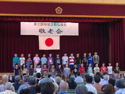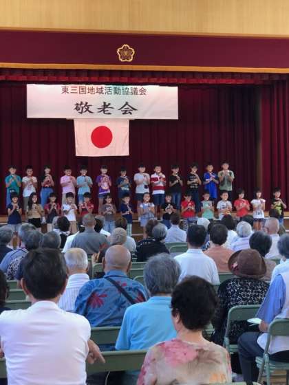 東三国地域活動協議会主催の敬老会のお祝いに、3年生がリコーダーと合唱を披露した後、お手紙を読みました。