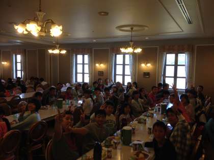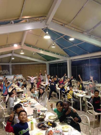 宿舎のともやま観光ホテルでの夕食は、バーベキュー。みんないい顔して食べています。思いっきり遊んで、思いっきり食べたので、夜はよく眠れるといいな。