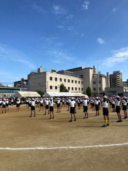 プログラム1番準備運動です。これから全力で演技や競技ができるよう、しっかり体をほぐしています。