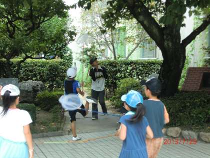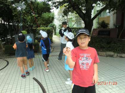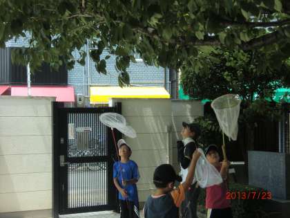 「いきいき」に参加している子どもたちが虫取り網を持って学校の正門の桜の木を見上げています。「おった。おった。」セミ取りに挑戦。学校でセミ取りを楽しんでいました。でも捕まえても逃がしてあげてや。