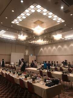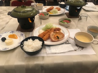 夕食です。結婚式場も併設されているような豪華なところで、いただきました。おなかも心も満腹になりそうです。