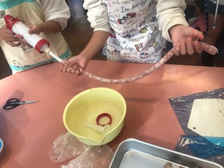 手づくりウインナー作りに挑戦しています。美味しいウインナーができますでしょうか。