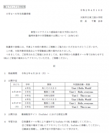 新型コロナウイルス感染症の拡大予防に向けた臨時休業中の学習動画の公開について