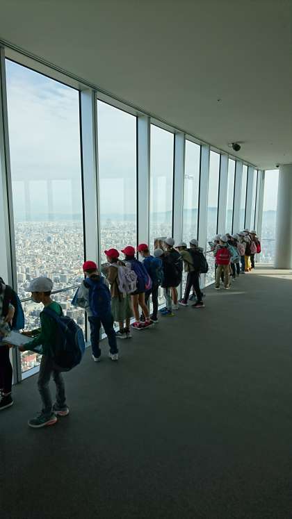 3年生が社会見学として、環状線を一周し、あべのハルカスに行きました。自分たちの暮らす大阪市のまちの様子を電車の車窓から見学しました。またあべのハルカスでは展望台から一望できる大阪のまちの様子に、圧倒されながらも、発見したことを熱心にワークシートに書き込む様子が見られました。