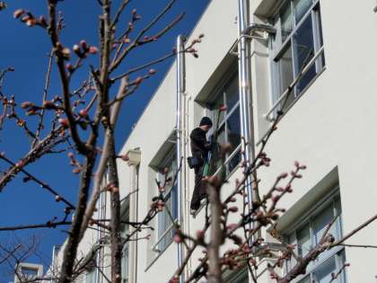 2月19日(木)業者の方に高所窓清掃をしていただきました。ふだんなかなか手の届きにくい場所の掃除をしていただき、きれいになりました。正門の梅のつぼみもずいぶんふくらんできました。