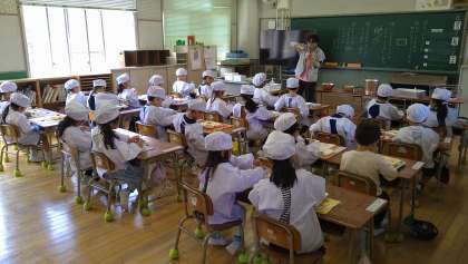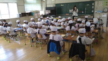 「いただきます」の前に、「マスクを外してからはおしゃべりをせずに食べましょう」などの先生から給食を食べるときの諸注意がありました。