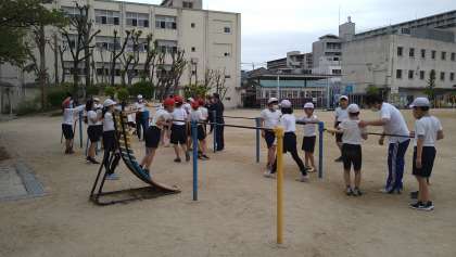 逆上がりを成功させるためのポイントを教えてもらっています。