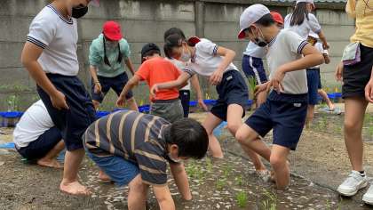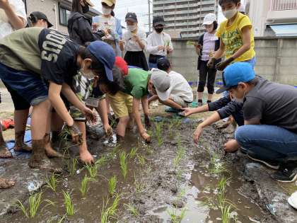 田んぼの土に足をとられるので移動に苦労しながらも、みんなで協力して一つひとつ丁寧に苗を植えていきました。秋には「稲刈り」「脱穀」を予定しています。今から収穫が楽しみです。