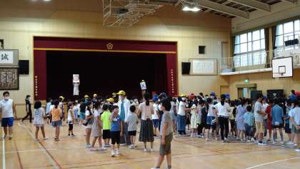 本日の児童集会はたてわり班の1組グループで集まりました。内容は「○×クイズ」で、集会委員会が作った問題は、わかりやすいものもあれば、グループのみんなで考えても答えが割れるようなものもあり、みんな楽しんでゲームに取り組んでいました。