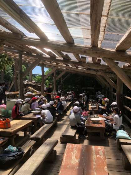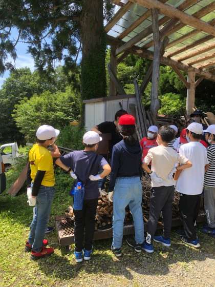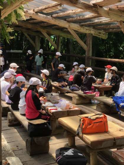 高丸山から下山を終え、休憩を経て、飯盒炊爨が始まりました。グリーンロッヂのご主人から、かまどの作り方や、野菜の切り方、水の量の説明をしていただき、各班、作業に取りかかりました。