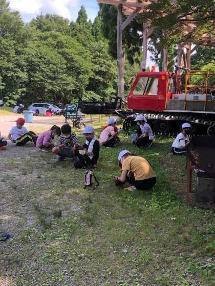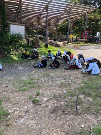 スイカを食べた後は、焼き板作りです。焼いた板の表面にに付着した炭の粉をタワシや新聞紙で綺麗に磨いた後に、アルスカラーで絵や模様、文字等を書きます。一生懸命焼き板を磨いています。