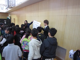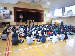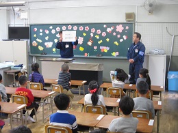 一年生の教室では、「セイフティーよどがわ」のパトロール隊員の方に、安全な登下校の方法について話していただきました。