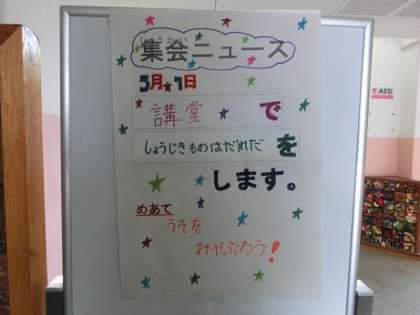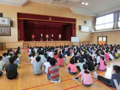 「なんでやねん!」と突っ込む子ども、「意味わからん!」とリズム?に合わせて言う子もおり、楽しい集会となりました。