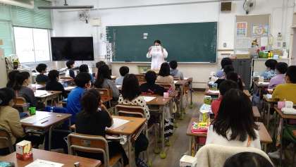 まず、始めに教室でむし歯ができる仕組みについて学習をしました。どのような食べ方をするとむし歯になりやすいか、またむし歯になるのを防ぐための方法等について教えていただきました。