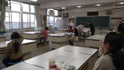 次に家庭科室に移動して、フッ化物洗口をしました。比較的低濃度のフッ化物水溶液を口に含んで、洗口(ぶくぶくうがい)することによって、永久歯のむし歯を予防します。