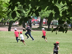 万博公園の芝生広場では、班ごとに遊びを考えて楽しみました。「ハンカチ落とし」や「だるまさんがころんだ」「おにごっこ」と懐かしい遊びも多く見られました。