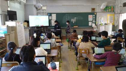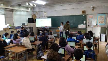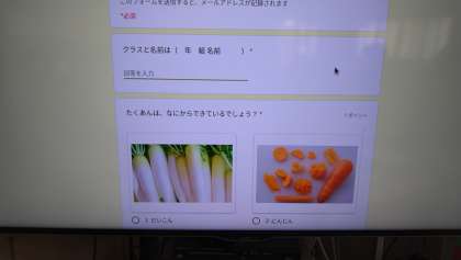 この期間、給食委員会から給食に係るクイズが出題されています。1時間目が始まる前の「東三国タイム」に給食委員が各クラスに出向いて、クイズについて説明をしていました。2年生以上は1人1台端末でクイズに答えます。