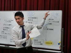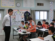 3時間目は、多目的室で本日のメイン講師である村上哲哉選手から【夢を持つことの大切さや、あきらめないことが夢の実現につながる】ということを聞かせていただきました。ユニフォームからスーツに着替えた村上選手は、自身のサッカー人生を振り返りながらわかりやすく話されました。子どもたちは、将来の自分をイメージして「ワクワク未来シート」に記入し、自身の夢について発表しあいました。最後には村上選手からのメッセージビデオも上映され、2012年フットサルW杯出場に向けての道のりがとてもよくわかりました。本物の日本代表ユニフォームやアジアカップのメダル(金・銅)も見せていただき感動しました。