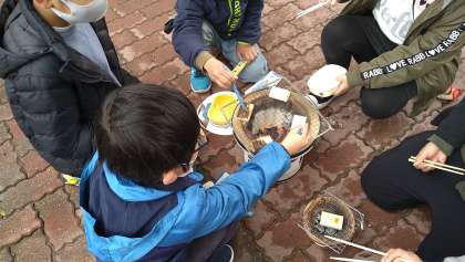 炭を使っての火起こしでは、どうやったら炭に着火するか友だちと試行錯誤を繰り返し、一生懸命にうちわであおぐ姿が見られました。「だんだん炭が赤くなってきた!」「バーベキューの時の匂いがする!」と苦労した分、着火したときの喜びも大きいようでした。