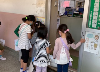 今日は、グループに分かれて、2年生が1年生を案内しました。案内をする部屋の前で、2年生の説明を聞いて、1年生が地図にシールを貼ります。