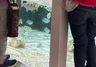 水槽は、目の前や低い位置にあって、子どもでも見やすく工夫されていました。左側の写真が水槽ですが、魚が泳いでいるのが見えるでしょうか。子ども達は、上から覗き込んだり、横から見たりして、新しい発見をするたびに歓声をあげていました。