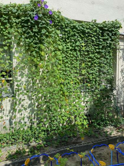 1年生が育てているアサガオの植木鉢の後ろに、緑のカーテンが広がっています。