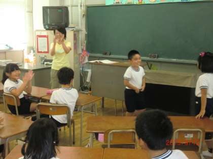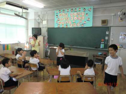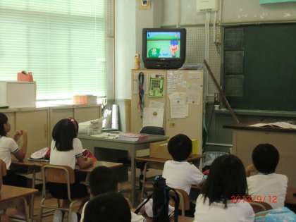 9月12日(木)ついに始まりました、全学年の英語音声指導(フォニックス)が。応援団の練習があったり、運動会の練習があったり、敬老会の準備があったりとなかなか大変な中、時間をやりくりして各教室で英語音声指導がスタートしました。2年生は英語であいさつをしあったり、歌を歌ったりしましたが、どの子もちょっとはずかしそうなのに、とてもうれしそうなニコニコ顔でした。毎週15分を3日続けていきます。楽しんで学習しようね。サンキュー。