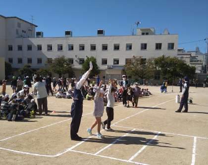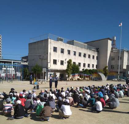 淀川警察署、セーフティー淀川の方たちに、交通ルールを教えていただきました。実技では仮想道路(運動場に線を引いた道)での歩行練習をしました。