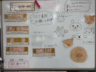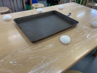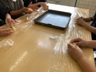 パン生地のガス抜きをして具を包み、成形をします。具にチョコチップかチーズを入れ、思い思いの形にしました。美味しいパンが焼き上がりますように!