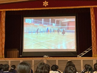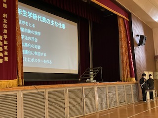 体育館で、中学校の校長先生のご挨拶のあと、生徒会の中学生が、中学校生活についてのスライドと部活動紹介の映像を流して、丁寧に説明をしてくれました。小学生からの質問にも、わかりやすく答えてくれました。