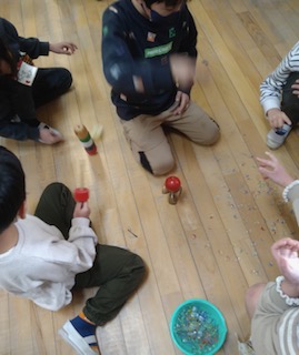休み時間に、1年生の子たちが珍しい遊びをしていました。生活科の学習で習ったようです。駒にだるま落とし、おはじきにお手玉、なかなか上手にやっていました。