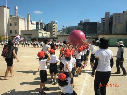 運動会のプログラムの中には全員で行う競技があります。大玉運びです。これこそ力を合わせなければうまくいきません。1年生もうまく運んでね。