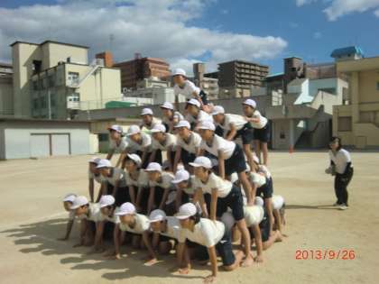 5,6年の組体操がいよいよ完成目前です。1人技、2人技、3人4人と増えていきます。3段塔やピラミッドなどドキドキするような技もあります。今日は強い風の中、技をしっかり決めていました。強い風に立ち向かう姿はとても力強いものでした。つらいこと、苦しいことにも負けずに立ち向かっていくようでとてもかっこよかったです。運動会が楽しみです。負けるなよ。頑張れよ。