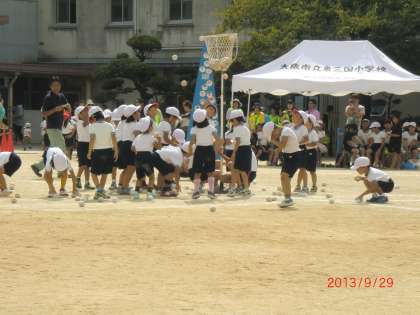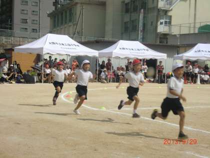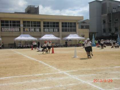 1年玉入れ、2年個人走、3年2人3脚。2人3脚は上手に駆け抜ける組と何度も転倒する組とゴール手前あと一息というところで転倒する組がありました。2人の息が大事なことがよくわかります。お互いが相手に合わそうとしたり、急がず同じペースでいこうとしたりするとうまくいくのかもしれません。