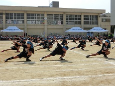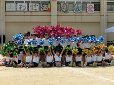 最初の団体演技は、低学年の「ゲッタ バンバン!」でした。2年生がリードし1年生がしっかりとついていき、音楽に合わせて素晴らしいダンスを披露してくれました。カラフルなポンポンを上手に扱い、見ごたえのある演技でした。