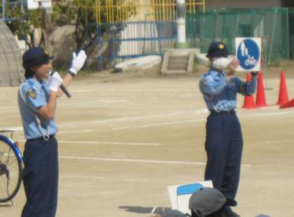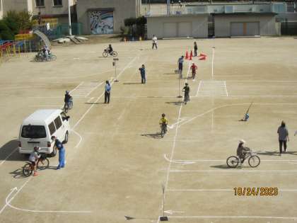 3年生からは、自転車の正しい乗り方です。「自転車は車両の仲間です。間違った乗り方をすると、凶器にもなります」という話に、真剣に聞き入っていました。自転車への乗り降りの仕方や安全確認のポイントを教えてていただきました。実技指導では、歩道から車道へ出るときの安全確認や信号の渡り方を見ていただきました。スタートするときの安全確認、抜けている人が多かったようです。