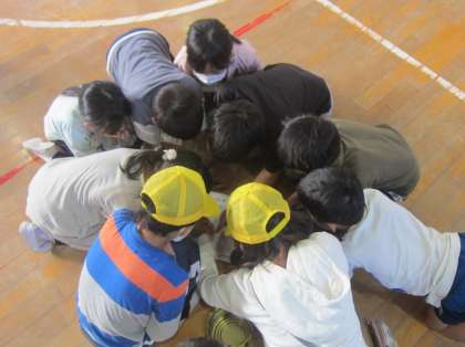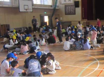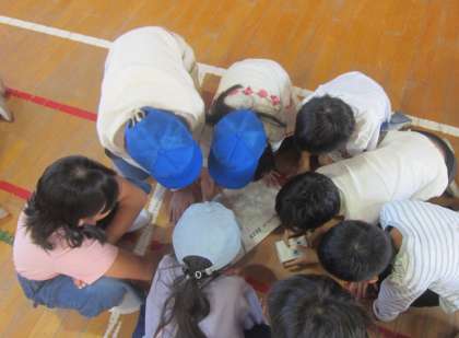 今朝は、児童集会の時間を使って、たてわり班での相談です。班長中心に班のめあてを決めたり、回るポイントの順を確認したりしました。班長は、この日に向けてあらかじめ集まって、班長会議を開いています。