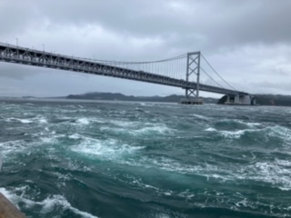 大鳴門橋の下の潮の流れによって渦潮ができます。ちょうど大きな渦潮ができる時間で、たくさん見ることができました。写真で伝わるでしょうか。